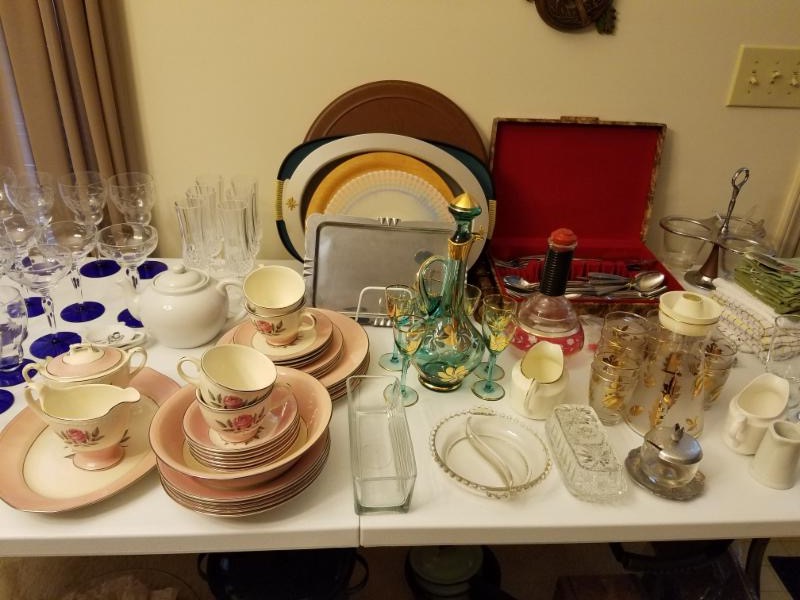 Bar ware/Kitchen:cocktail sets with decanters, lots of stemware sets with all types of pieces, bar gadgets, mixers, wine rack, German beer steins, shot glasses, beer glasses, vintage and current kitchen items galore...cookware, bake ware, serving pieces, coasters, gadgets galore, trays, bowls, sets of dishes: "Autumn Gold" service for 12++ and matching glassware and serving pieces, "Norwegian Rose" service for 4+, crystal champagnes, platters, tidbits and hors d'oevres servers, stainless flatware, casseroles, George Forman, microwave, toaster, blender