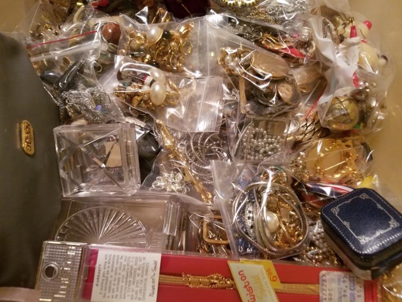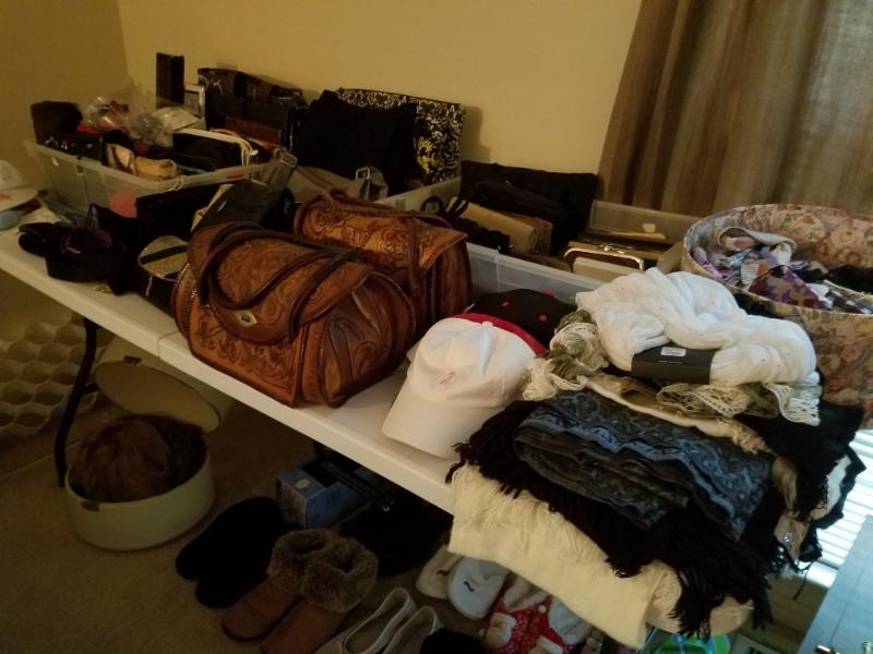 Vintage Jewelry/Clothing/Personals: large collection of vintage costume jewelry and watches, jewelry armoire, jewelry boxes, perfume bottles and trays, boudoir items, purses and wallets including 2 tooled leather handbags, scarves, hats, boots, shoes (9-1/2 mostly), wigs and hair pieces, hat boxes, slippers, newish women's clothes: blouses, shirts, pants, coats, jackets, sweaters, lingerie, loungewear, sandals, fur shoulder wrap, shoe racks, bathroom and personal products galore including Mary Kay