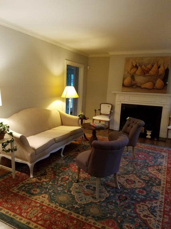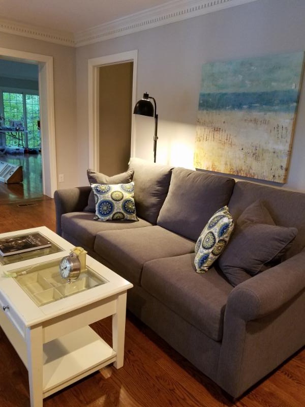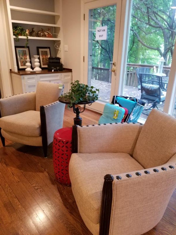 Frenchy sofa, dark grey sofa, white coffee table, pineapple round table, end tables, Ethan Allen chest, mirrored gilt chest, pair French carved wood arm chairs, pair dark grey linen round back chairs, pair linen upholstered chairs, plant stand, pair modern white rectangle work tables, 4 black/rush bistro chairs, white round drop leaf table, pair 6-drawer wide brown wicker chests, mahogany small 3-drawer foyer chest, pair white tall book shelves, chrome shelves, oatmeal sectional, white end table chest, three beds, white wicker desk and chair; white chest and matching pair white side tables, white kidney vanity and pink velveteen stool/chair, mod black vanity, black TV stand, roll-away twin bed, heavy white porch rocker, white plastic round table, nice deck table with umbrella and 4 chairs, black round bistro table and 4 chairs, deck umbrella, 3-cubby storage unit in box, London/Paris canvas screen, antique wood kitchen chair, alum desk/kitchen chair, wood valet stand, dark brown velveteen chaise