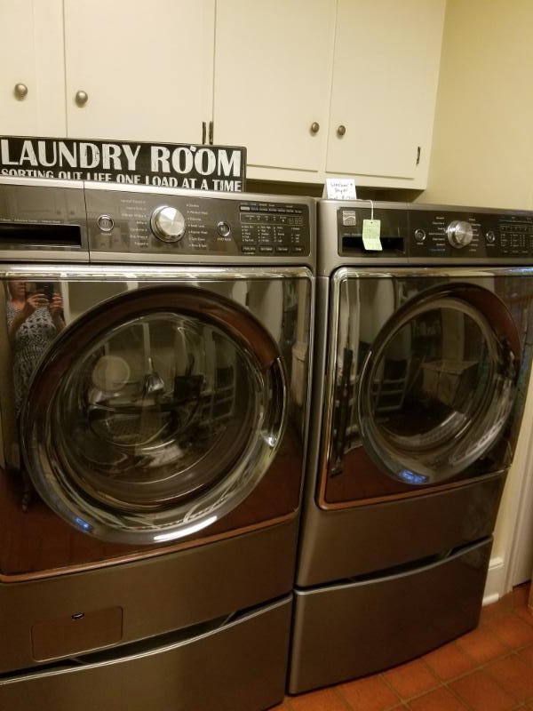 Elite Kenmore front loading washer and dryer like new with pedestal drawers, professional ironing board, Shark vac, Dyson vac with all attachments, 2 Miele vacs, cleaning products galore, French canvas laundry cart, bedding