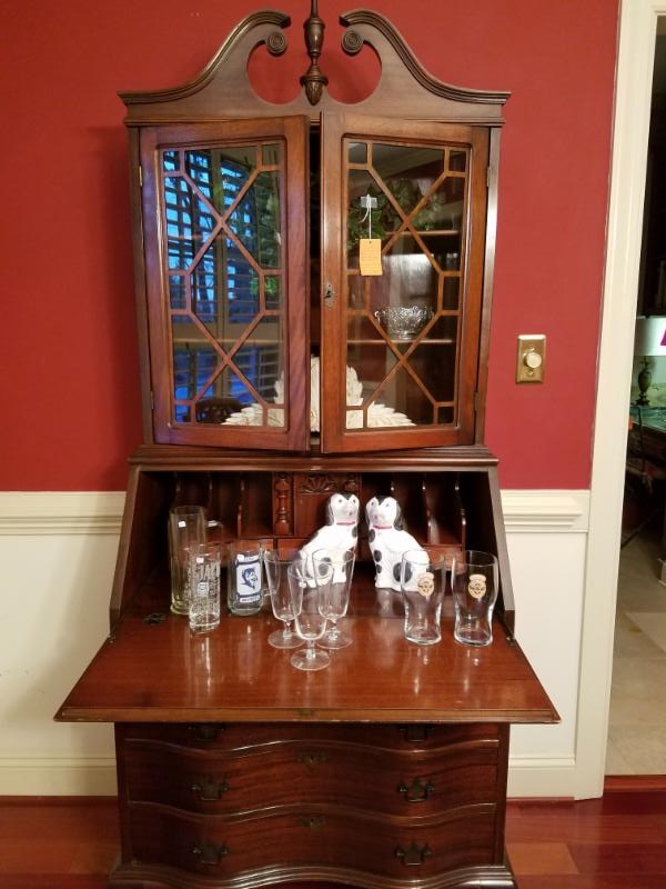 Furniture: dining table and 6 chairs with 2 leaves, lighted china cabinet, drop leaf bar, antique slim secretary, light wood kitchen table and 4 chairs, sofas, 3 coffee tables, brass, glass, wicker and wood side tables, Henredon club chairs, gilt buffet chest, upholstered and leather side chairs, leather recliner, leather double recliner sofa, book cases, standing photo frames screen, dark flat screen credenza, stone top buffet, California King poster bed, full bookcase headboard bed, armoire, gentleman's L desk with matching side cabinet, green leather desk chair, Chippendale mahogany hanging shelf with drawers, iron baker's rack with marble shelves, pair metal red seat bar chairs, pair larger iron bar chairs with arms, iron desk chair with cushion,