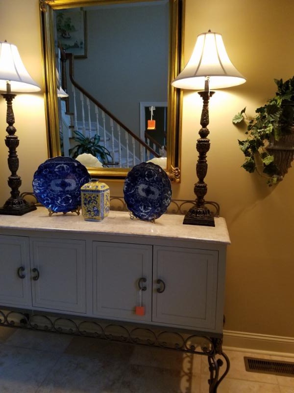 Art, Lamps, Mirrors, Rugs, Decor: Oil paintings, framed prints, botanicals, forest and pastoral scapes, Asian paintings and prints, oversized and standard sizes, quality framing; desk and table lamps galore in all sizes and styles and shapes, pairs of candlestick lamps including a very large foyer pair; hanging mirrors in many sizes and frame styles including gilt, wood and pickled; wool area rugs, runners and carpets, 10x12 like new wool, 5x8 knotted wool, wool runner, sisal rugs in several large sizes; designer décor items include many glazed pottery pieces, wall sconces in many styles in plaster, metal, wood and gilt, oversized candle holders, urns and pedestals, porcelain dogs, cats, art glass pieces, scads of standing photo frames in many unique designs, coffee table books, items collected in world travel, throw pillows, storage baskets, several designer chandeliers and hanging pole lights, decorative painted plates, urns, collector cars - mostly 1950's - and car collector books