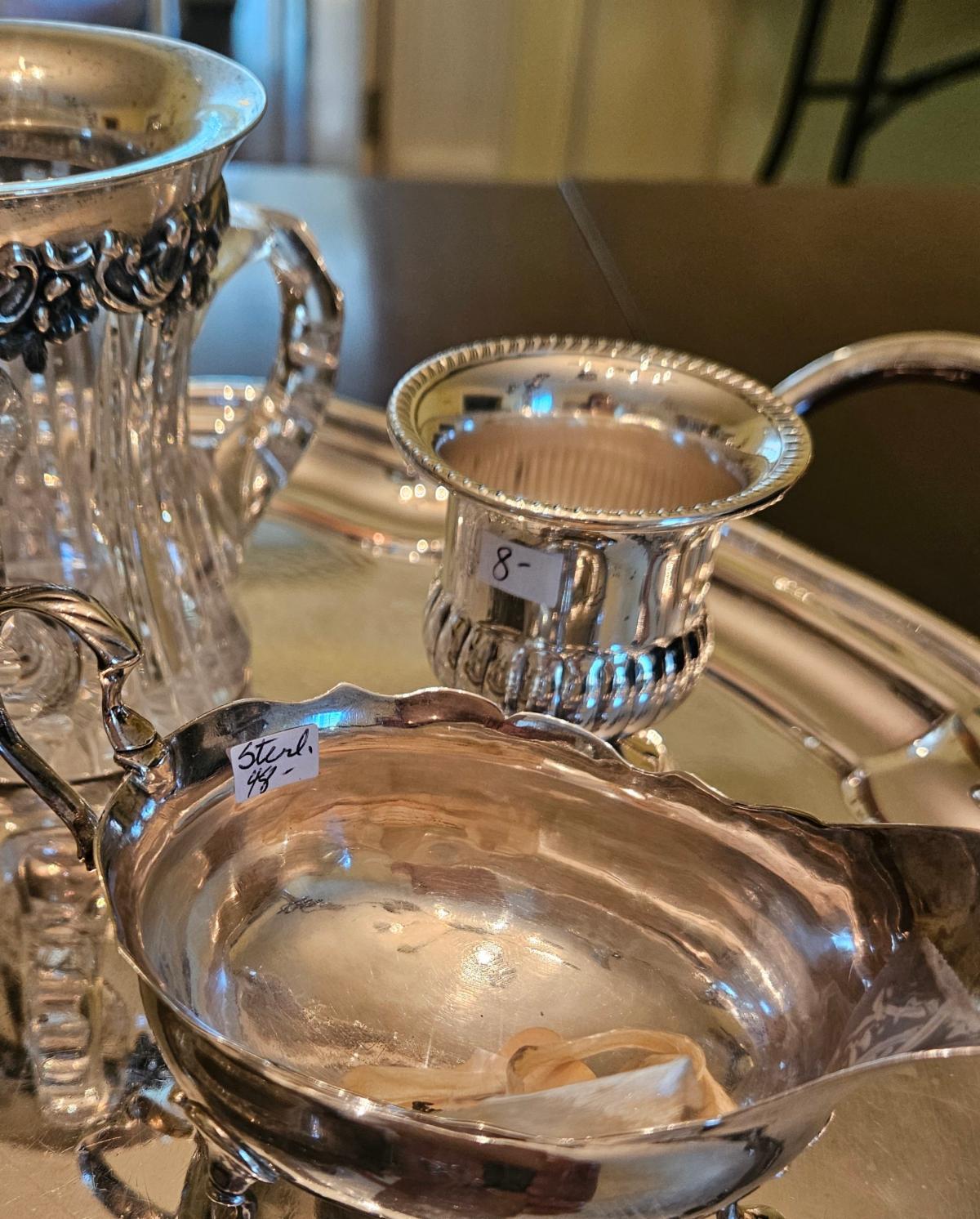 - Antique sterling bowls, pitchers, serving pieces, flatware, many date to 1700 and 1800s.