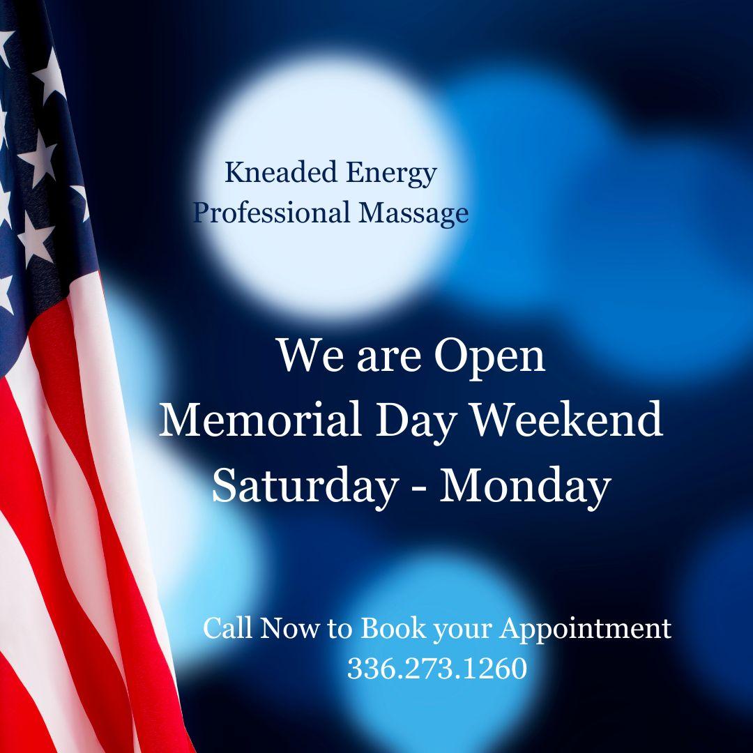 We are open on Memorial Day Monday. This is a normal work day for these therapists on the schedule and they wanted to keep their schedule - so it's a perfect day to come in and get some work. Call today to get scheduled, they will go quickly.