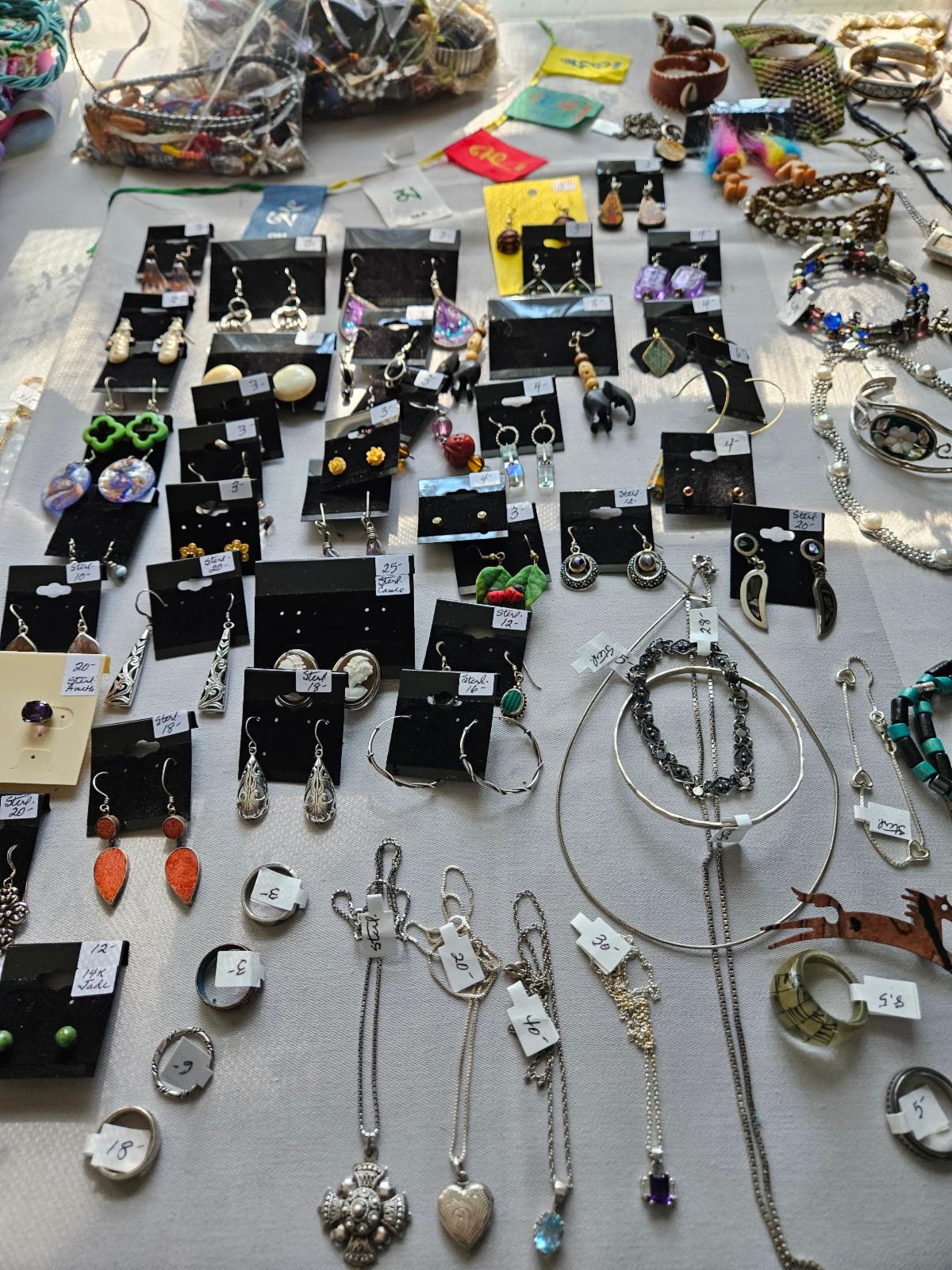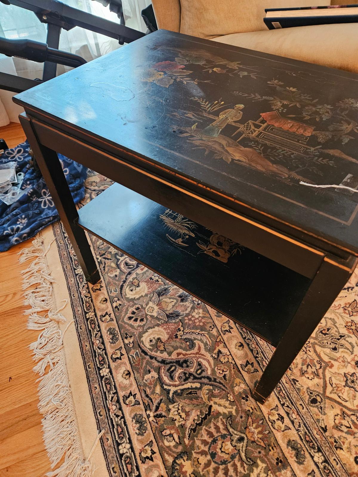 Sterling, fine and costume jewelry. Vintage and contemporary American and English furniture: living room, bedroom, office, dining, den, patio. Contemporary wood bistro table and 4 chairs. Very good antique fully inlaid overall writing desk/vanity with letter boxes, drawer and mirror, older English pub table and chairs. Marble top wash stand. Vintage sideboard, vintage drop front desk, smaller inlaid 4-drawer chest, another writing desk – this one is Globe, very good antique chest (1 plank?), sofa, coffee tables, swivel top game table/writing desk. Hand painted Asian side table, very good antique medium sized corner cabinet, 4 shieldback chairs, solid cherry hutch, other cherry furniture, pair club chairs. Variety of accent and side tables and chairs, chests, queen bed. Outdoor furniture, yard art, planters, hammock frame with hammock, yard tools and equipment, flowerpots, vases, etc. Thule bike rack and other water sports equipment.