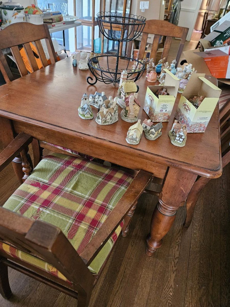 Misc: Beatrix Potter figurines: Royal Doulton (2), Royal Albert (18), Beswick (5). David Winter Cottages (10). Books (some early printings-all 50% off), 2 large WhiteVilla cat litter boxes NIB, electric tools, very nice bedding, some Harley Davidson stuff, HP ENVY 4520 printer, desk accessories, many books of first day stamp covers, antique Singer sewing machine table, DVD player and DVDs. Men’s military garb, suits, coats and jackets. And of course, everything else you expect to find from around the house at our other estate sales.