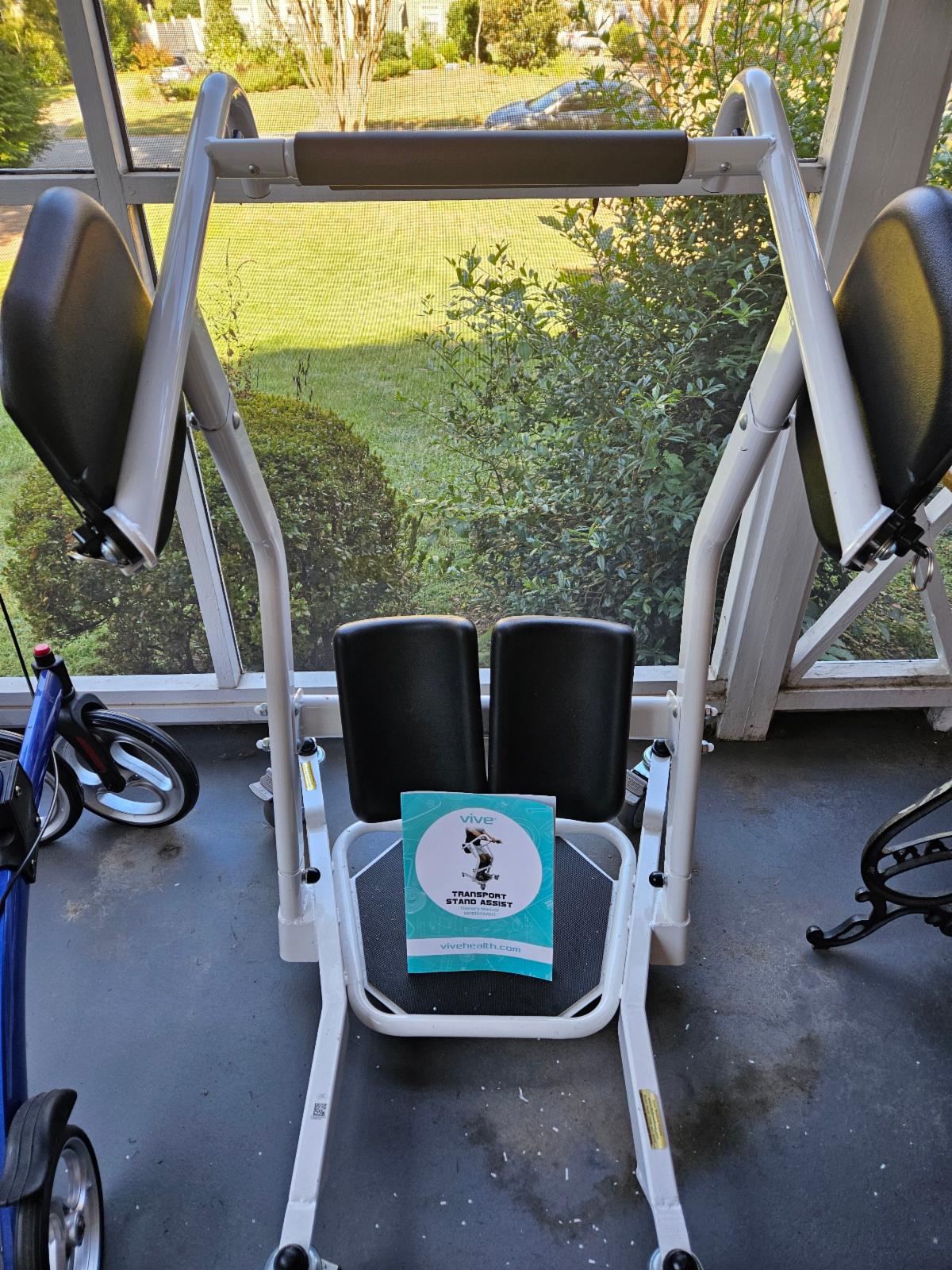 Heavy duty deluxe ambulatory equipment – mostly new, like new and gently used: VIVE Transport Stand Assist, Invacare Get-U-Up Patient Lift with slings, Ehucan Sit-to-Stand Sling, NOVA Dragon Rise Up Rollator, Guardian heavy duty walker with seat, 2 3-wheel rollators, VIPER + GT wheelchair, 2 tall adjustable bedside tables, Pure-Wick UNUSED female external catheter system, over toilet potty seat with extension rails, shower bench, bed support rail, supplies, various knee and foot braces and supports.