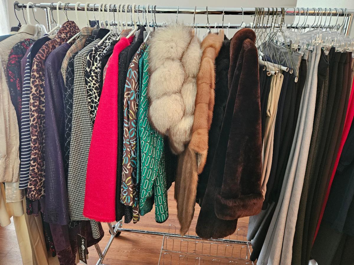 Seven racks of stylish and quality women’s clothes, sweaters, pants, shoes, evening wear, blouses, furs, coats, jackets, purses, luggage. Plus sizes 20-22, XL 2X and 3X. Some NWT. Chico’s, Talbot’s, Crown & Ivy, Alfred Dunner, Jones, Susan Bristol, Loft, Coldwater Creek, Athleta, Sag Harbor and many more.