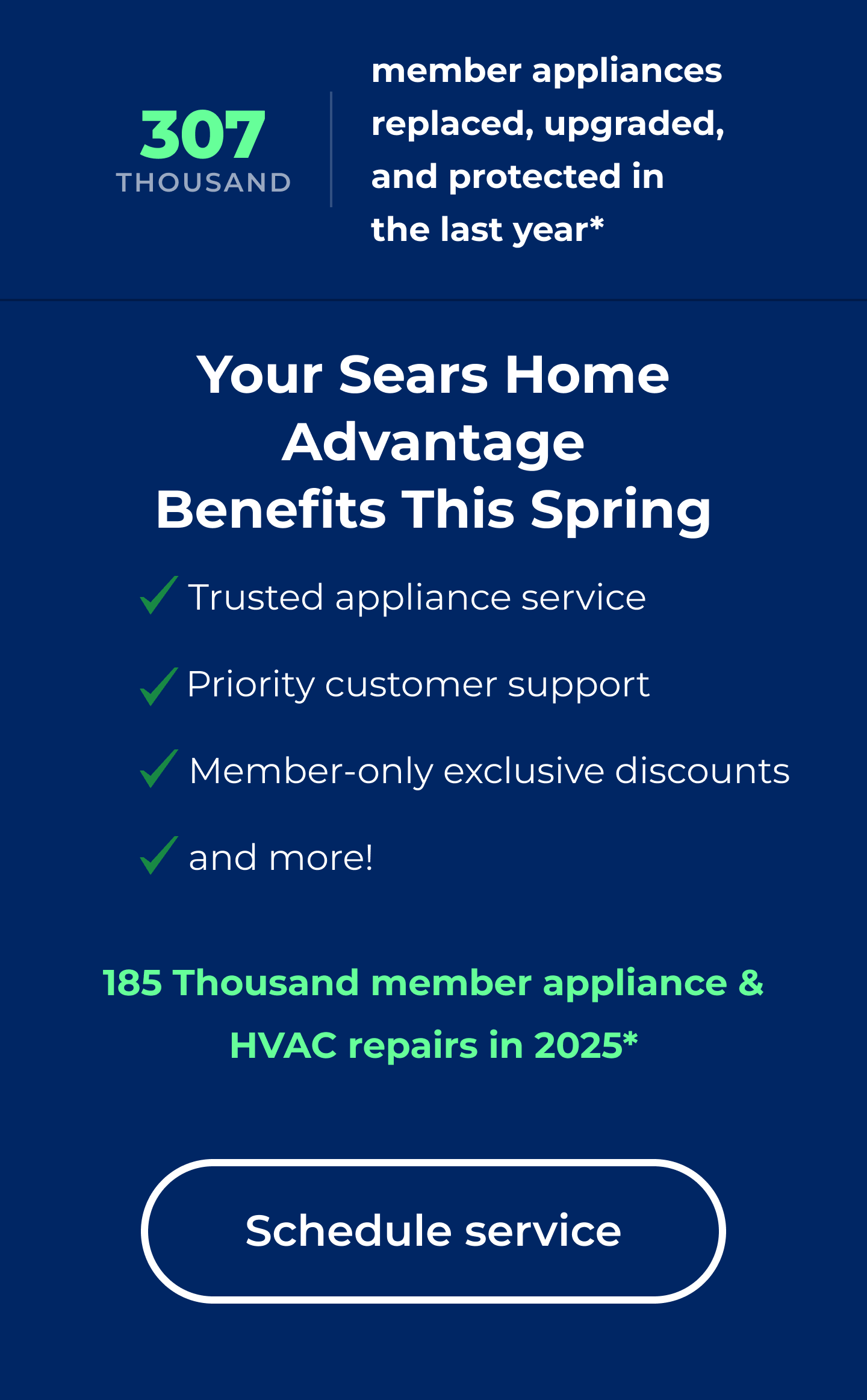 By accepting Shop Your Way® member benefits and offers, you agree to the Shop Your Way terms and conditions, available at www.shopyourway.com/terms. ¹$25 in points offer valid through 3/31/2026 only on Sears Home Services Repairs. Not valid on prior services, Clean & Maintain service, estimate declines, Protection Agreements, Home Warranty service, heating & cooling, electronics, lawn & garden or garage door repair. Not valid in conjunction with tech add-ons or preseason specials. Additional exclusions may apply. Points are not transferable, are not redeemable for cash and cannot be combined with other offers. Limit one reward per service repair order. Valid in The United States and Puerto Rico. ²SHAHVAC89 offer only available on completed in-home HVAC maintenance and repairs. The discount is applied before taxes and must be made in a single transaction. Not valid on prior sales. May not be combined with any other promotional offer and is subject to change without notice. Products not available in all areas. Offer expires 4/17/2026. *Data reflects aggregated activity from enrolled Members between March 15, 2025, and March 14, 2026. Figures are rounded down and based on available data. Provided for informational purposes only; not a guarantee of individual performance or future results. Transform Sears Home Services LLC is part of Sears Home Services. The "Sears Home Services" brand and logo is used with the permission of Transform SR Brands LLC. This is an advertisement. All offers and services may not be available in all areas. Prices may vary by location. Minimum order or other restrictions may apply. © 2026 Transform SR Brands LLC, 5407 Trillium Blvd. STE. B120 Hoffman Estates, IL 60192. All Rights Reserved. | |